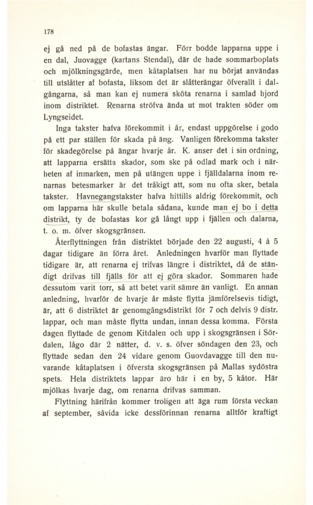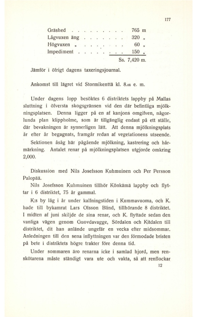 Nils Josefsson Kuhminen tilhører Könkämä lappby og flytter i 6 distriktet, 75 år gammel. Kuhmuinens by lå i år under kalvingstiden i Kummavuoma, og Kuhmuinen hadde Lars Olsson Blind som bykamerat, tilhørende 8 distriktet. I midten av juni skilte de sine reiner, og Kuhmuinen flyttet så den vanlige veien gjennom Guovdavagge, Sørdalen og Kitdalen til disktriktet, dit han kom omtrent en uke etter midtsommer. Årsaken til den sene innflyttingen var mangelen på beite i distriktets høyre trakter innen den tid. På sommeren er ikke reinene i samlet flokk, men reingjeterne måtte stadig ut og vokte så at ikke reinflokkene går ned i de bofastes enger. Før bodde samene oppe i en dal, Juovagge (Stendal), der de hadde sommerboplass og melkingsgjerde. Men plassen har nå begynt å brukes som utslåtter for bofaste, slik det er slåtteenger overalt i dalgangene, slik at man ikke lengre kan holde reinen i samlet flokk i distriktet. Reinen trekker likevel ut mot trakten sør for Lyngseidet. Ingen takster har forekommet i år, bare oppgjør til gode på et par steder for skade på eng. Vanligvis forekommer det takster på skadegodtgjørelse på enger hvert år. Kuhmuinen anser det som rett at samene erstatter skader som skjer på dyrket mark og i nærheten av innmark, men på utmarka oppe i fjelldalene innen reinens beitemarker er det kjedelig å, som nå ofte skjer, betale takster. Havnegangstakster hadde hittil aldri forekommet, og om samene skulle betale slike her så kunne man ikke bo i dette distrikt, for de bofastes kyr går langt opp i fjellet og dalene, til og med over skogsgrensen.