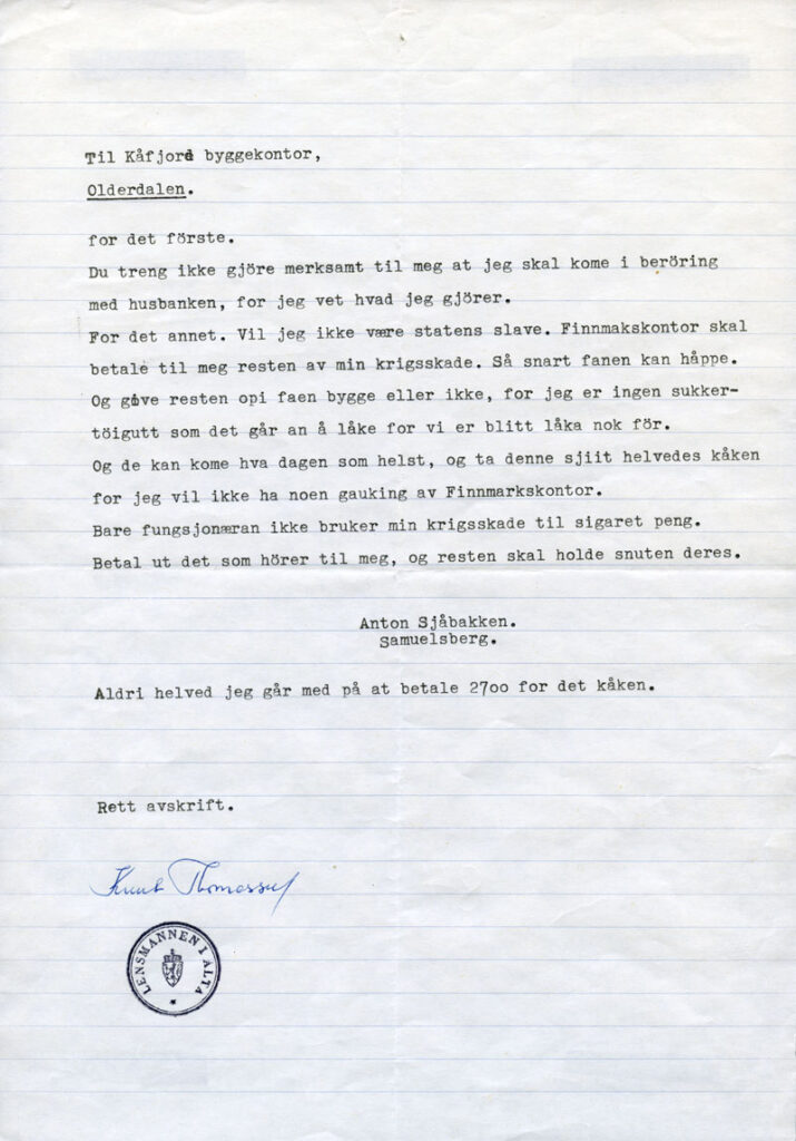 Du treng ikke gjøre merkesamt til meg at jeg skal kome i berøring med husbanken, for jeg vet hva jeg gjører. For det annet. Vil jeg ikke være statens slave. Finnmarkskontor skal betale til meg resten av min krigsskade. Så snart fanen kan håppe. Og give resten opi fanen bygge eller ike, for jeg er ingen sukkertøigutt som det går an å låke for vi er blitt låka nok før.